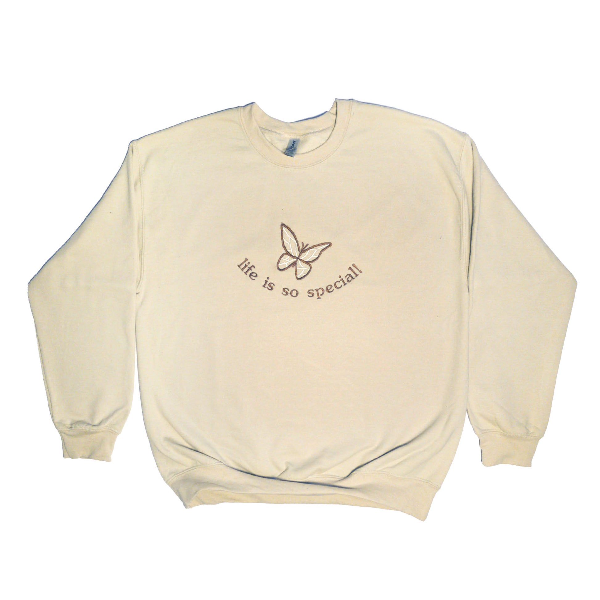 Embroidered "life is so special" butterfly design on a 50/50 Cotton Polyester heavy blend crew neck sweater.
